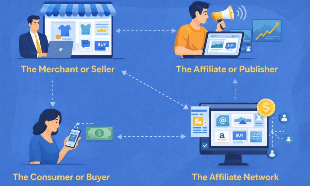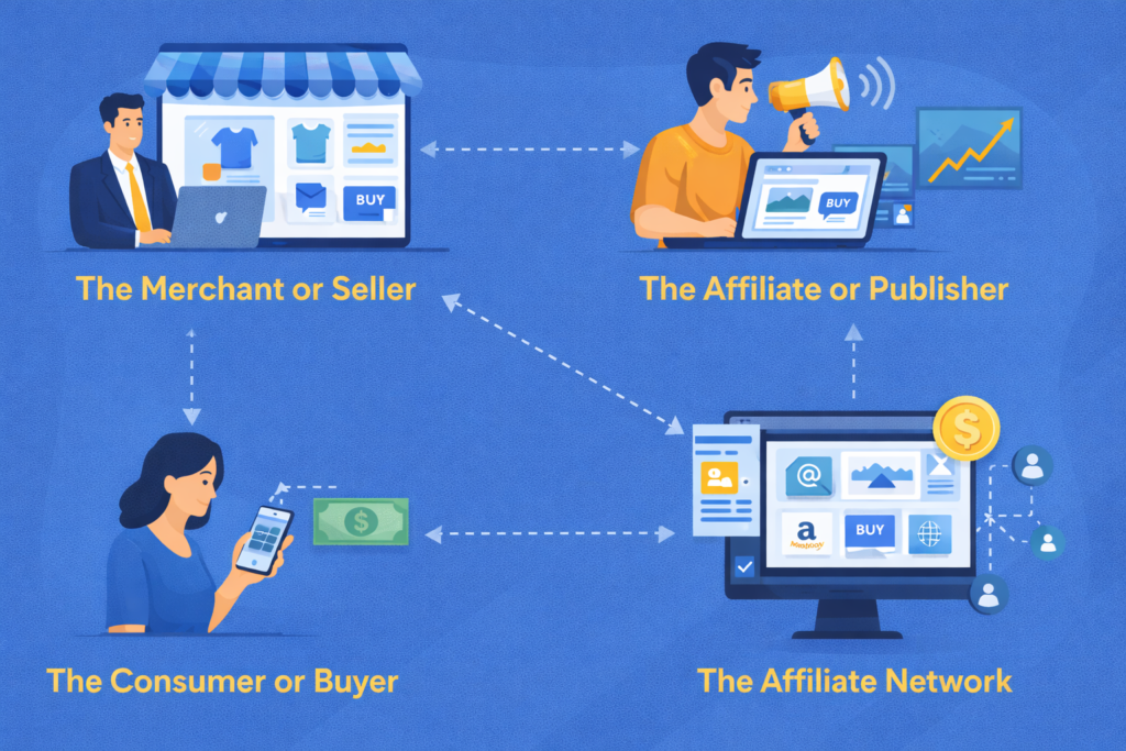 Affiliate marketing involves several key players who each contribute to the system’s success.